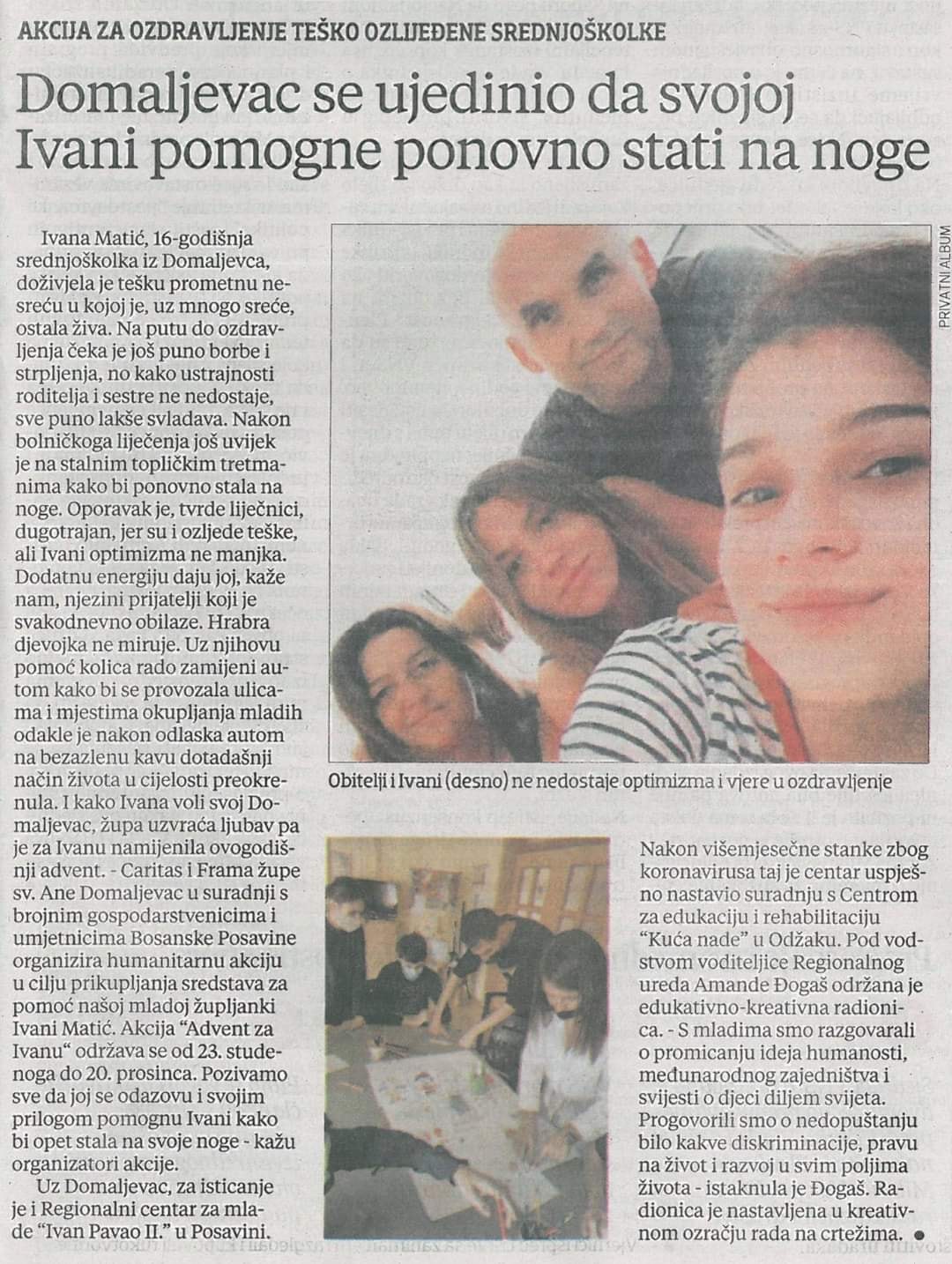 Humanitarna akcija pod nazivom „Advent za Ivanu“  ujedinila je  cjelokupno stanovništvo sa ovog područja kao i osobe iz dijaspore. Održane su brojne humanitarne akcije koje su organizirali sportski klubovi, udruge mladih, braniteljske udruge, vjerske institucije i organizacije, privatna poduzeća, javne institucije kao i veliki broj individualnih aktivnosti usmjerenih za pomoć mladoj osobi u potrebi.